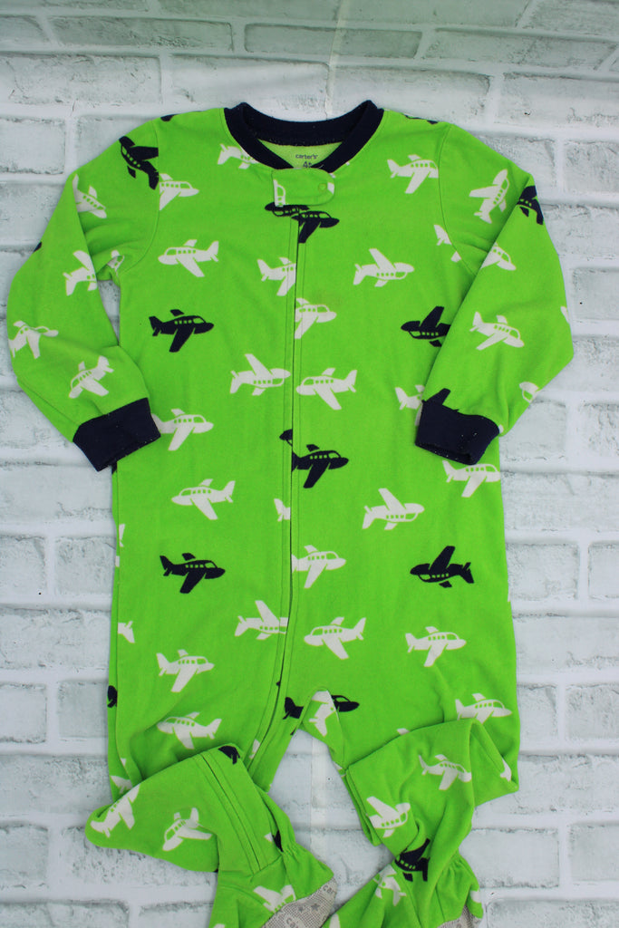 Carters, Green Airplane Fleece Sleeper, hole in one foot with some piling, 4T