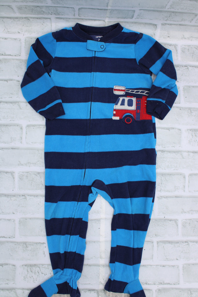 Carters, Blue Striped Firetruck Fleece sleeper, hole in toe, 2T