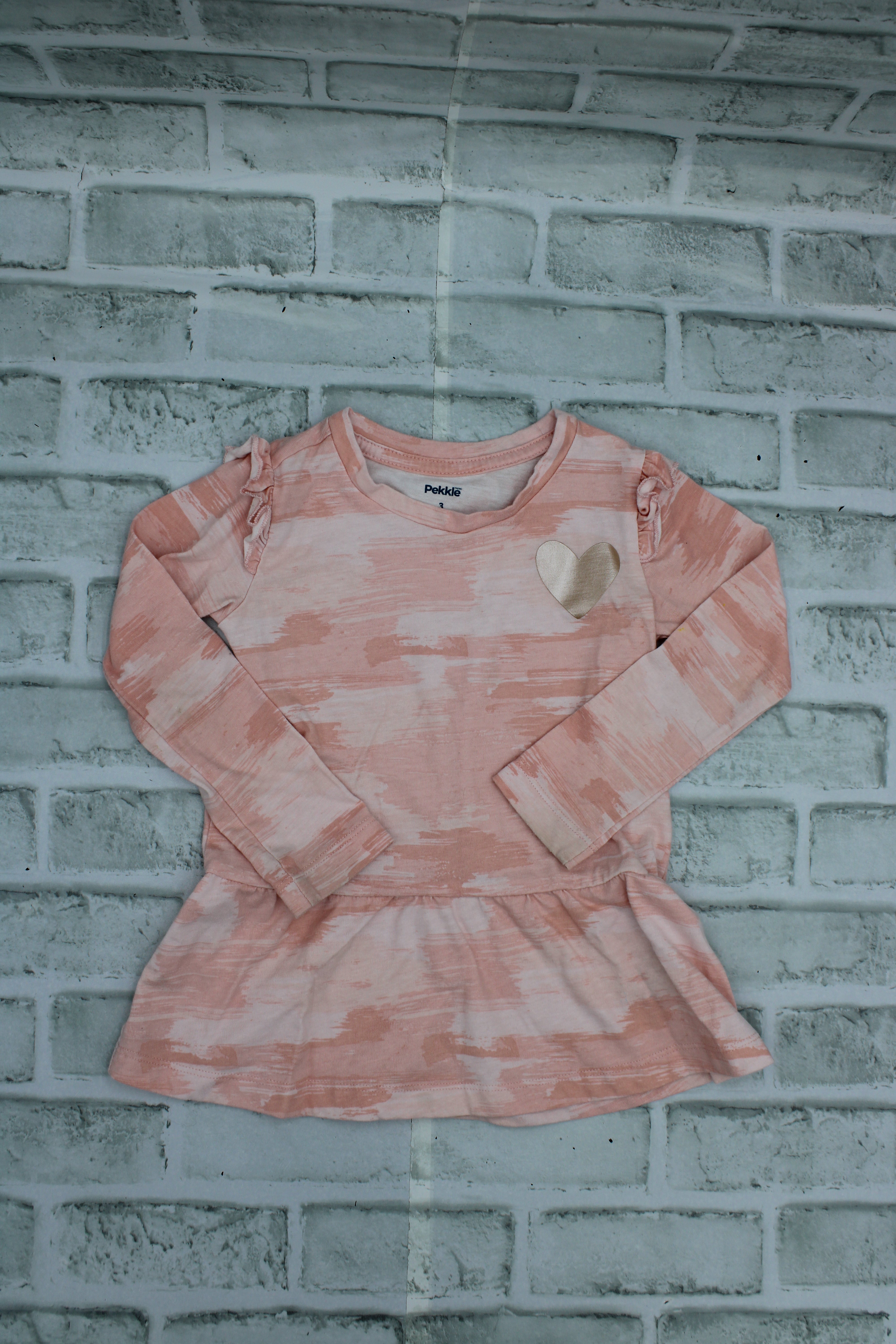 Pekkle, Peach Shirt, Small mark on arm, overall excellent condition, Size 3 is backordered and will ship as soon as it is back in stock.