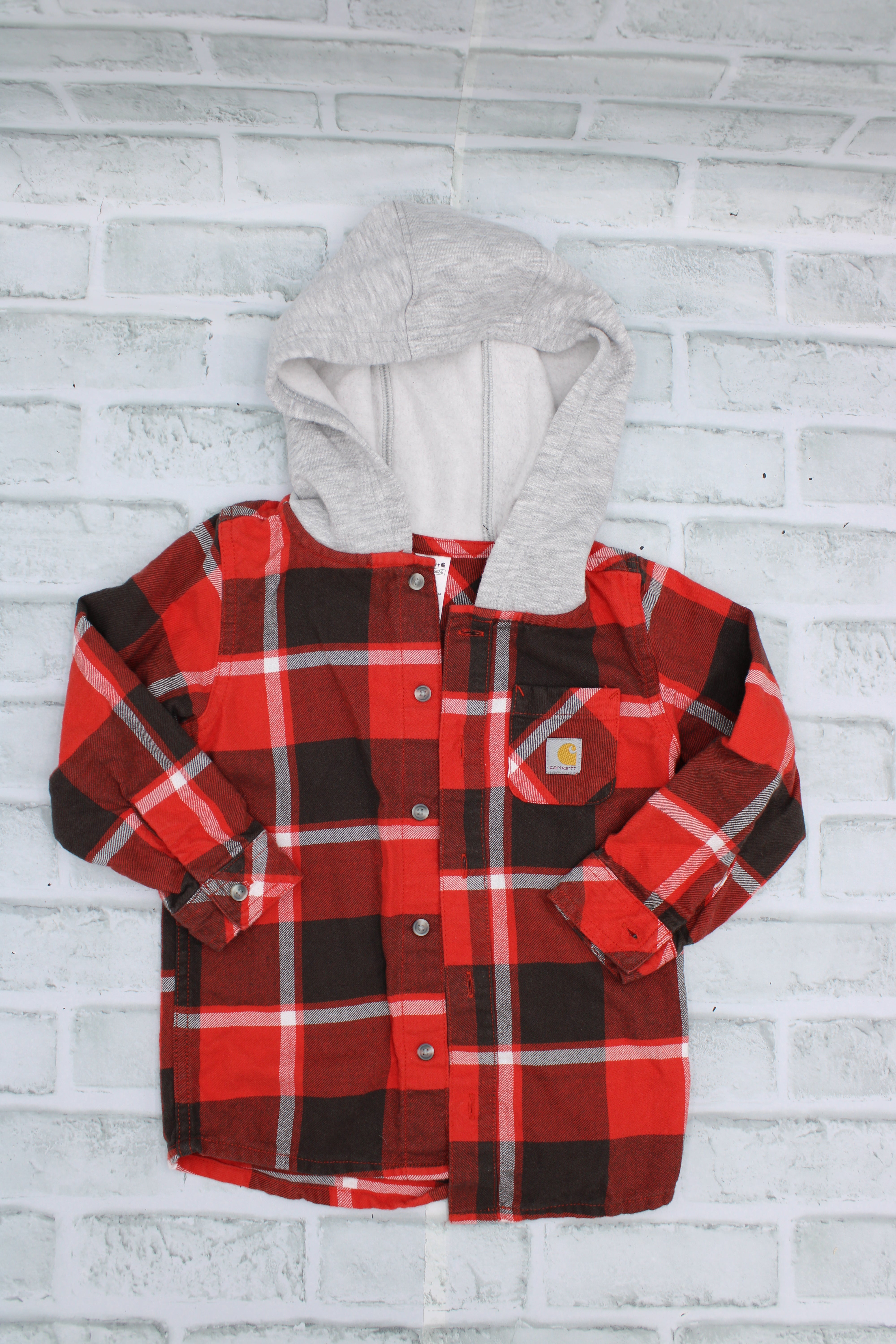 Carhartt, Red Plaid Button Up with Hood, LIKE NEW, 3T