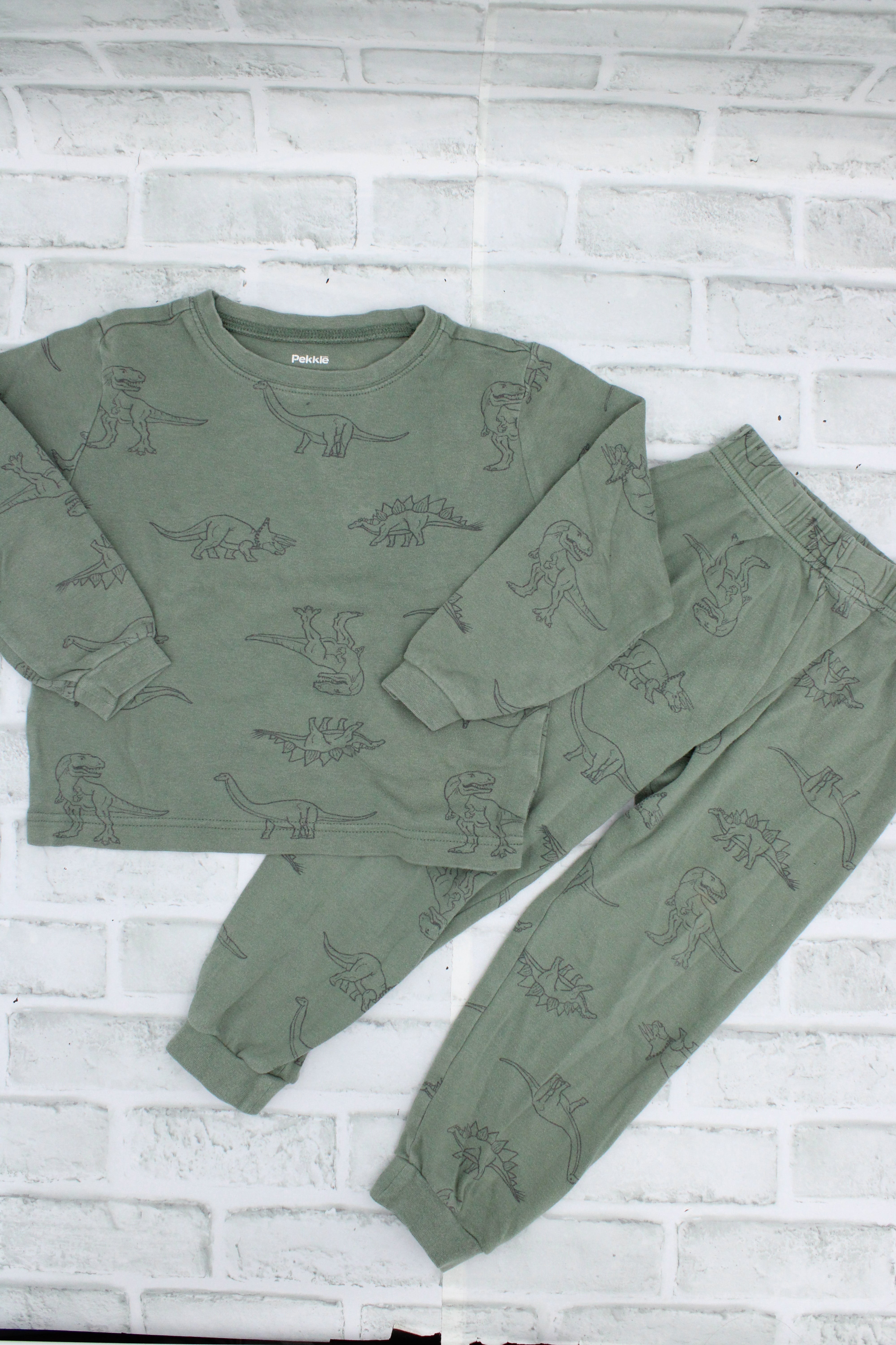 Pekkle, Green Dino PJ Set, small hole in back of top, stain on leg, Size 4/5