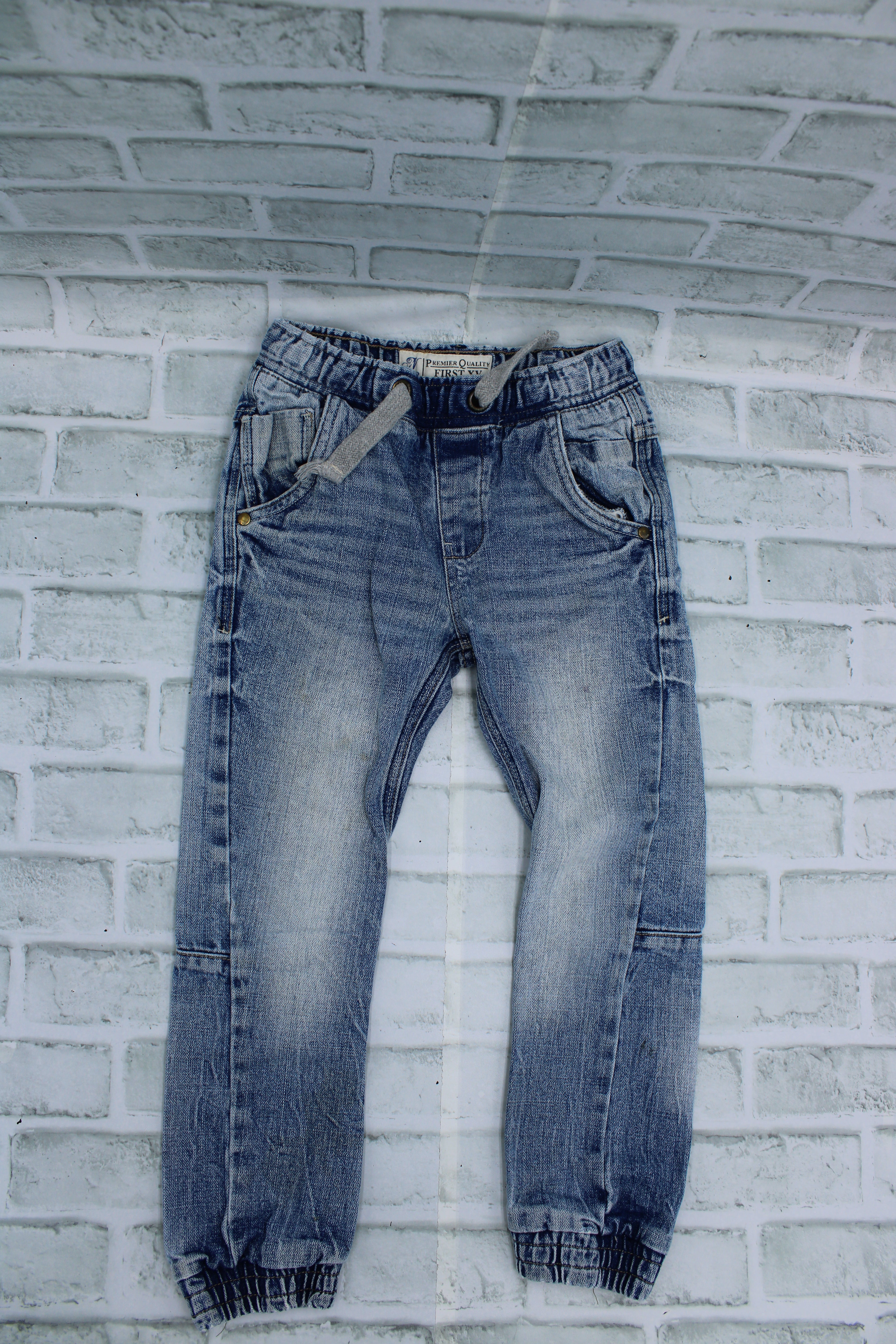 Next, Blue Jeans with tie string waistband, small stain near knee on leg, Size 6Y