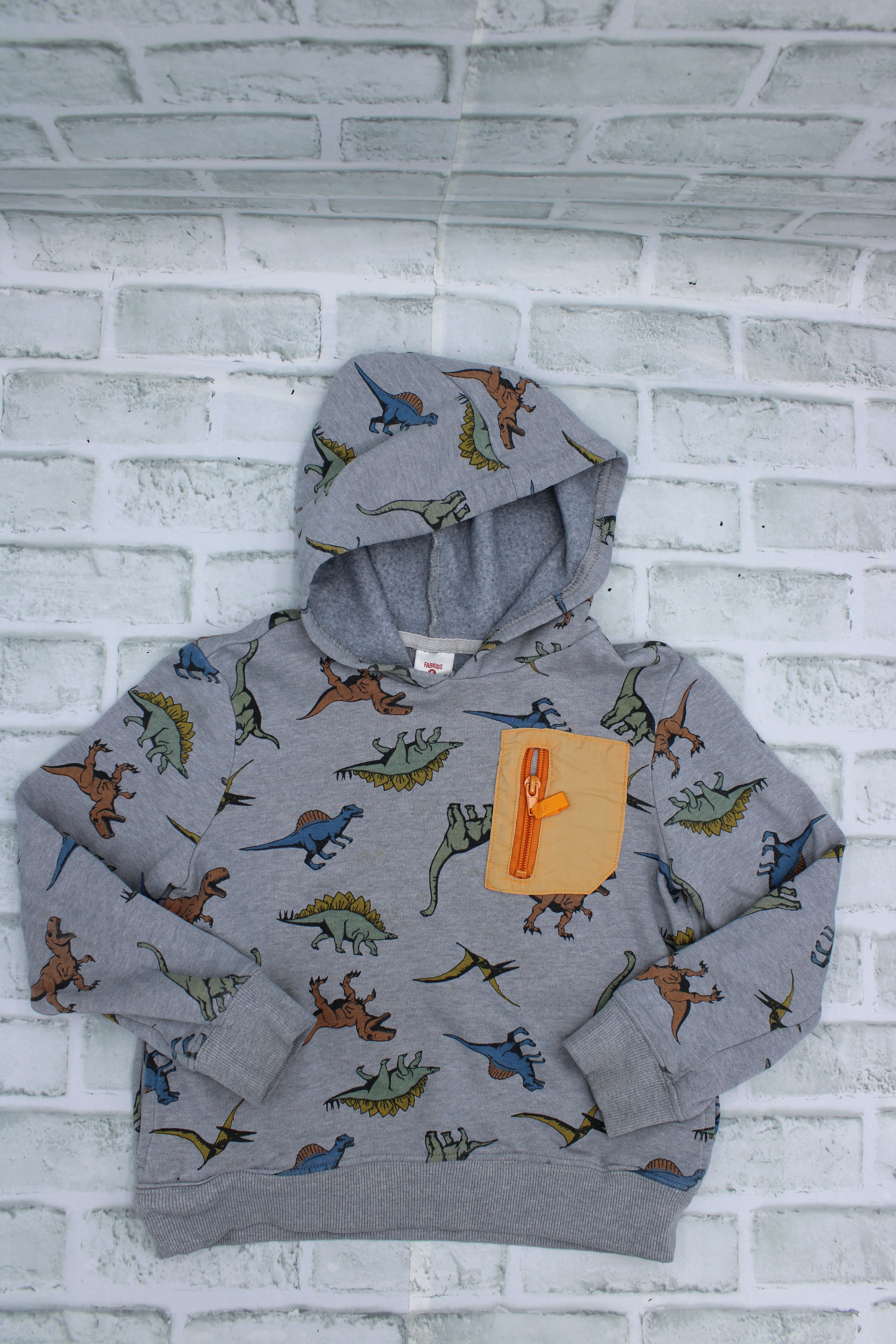 FabKids, Grey Dino Hoodie with Zip Pocket, Size 6/7