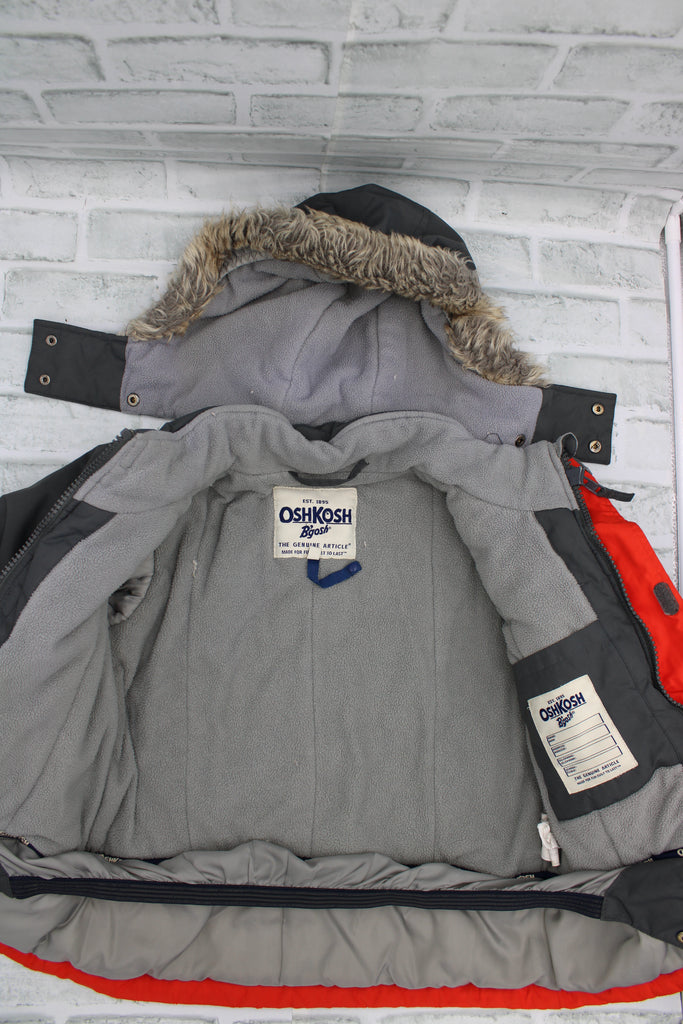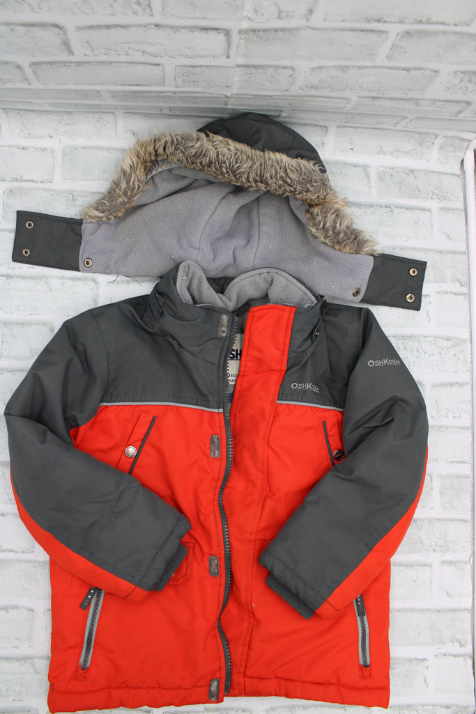 Osh Kosh, Grey and Orange Winter Jacket, has a tear on back of hood zipper, see photos, Size 6