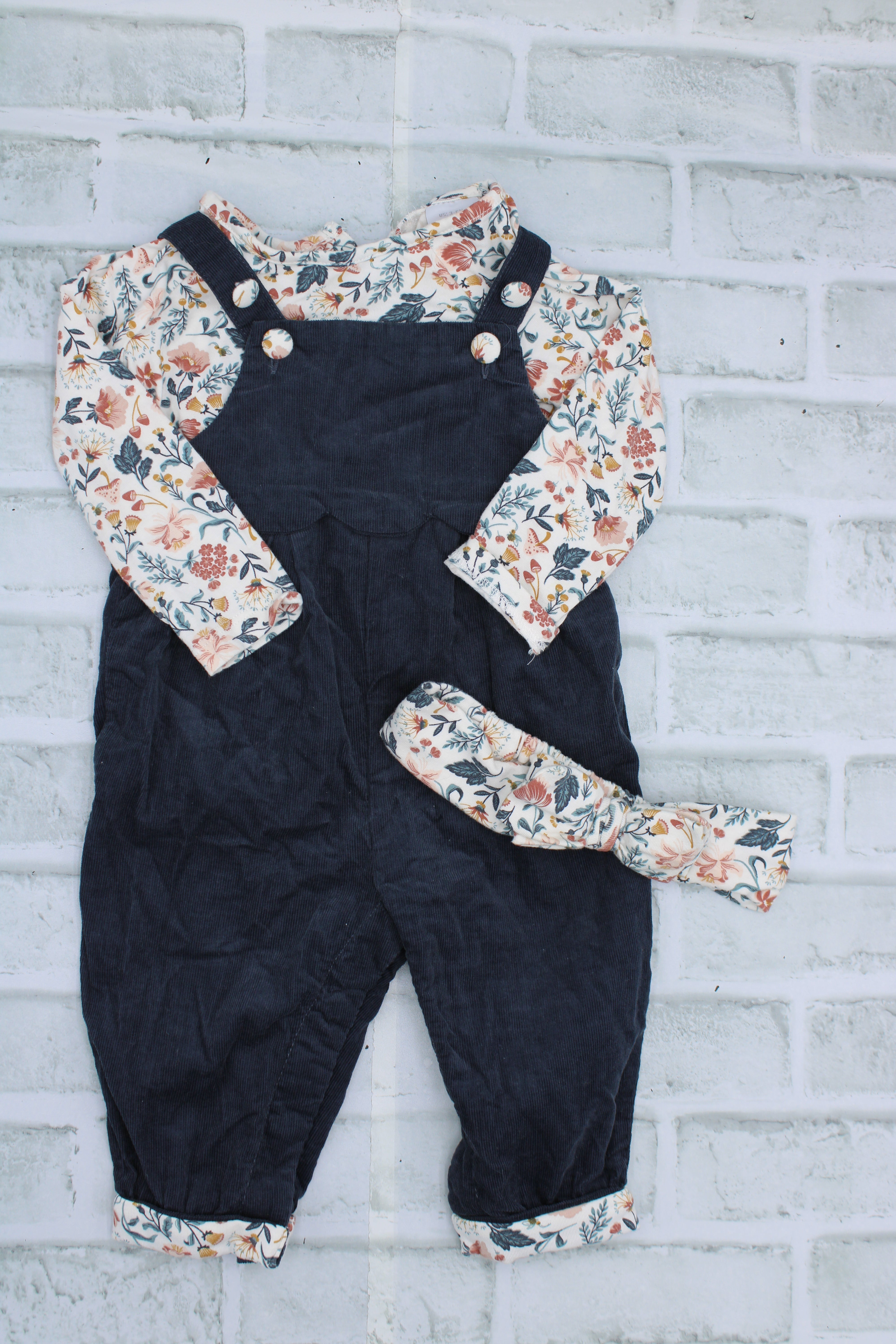 Tahari, Corduroy Overalls with Floral Top and Headband Set, LIKE NEW, 3-6 Months