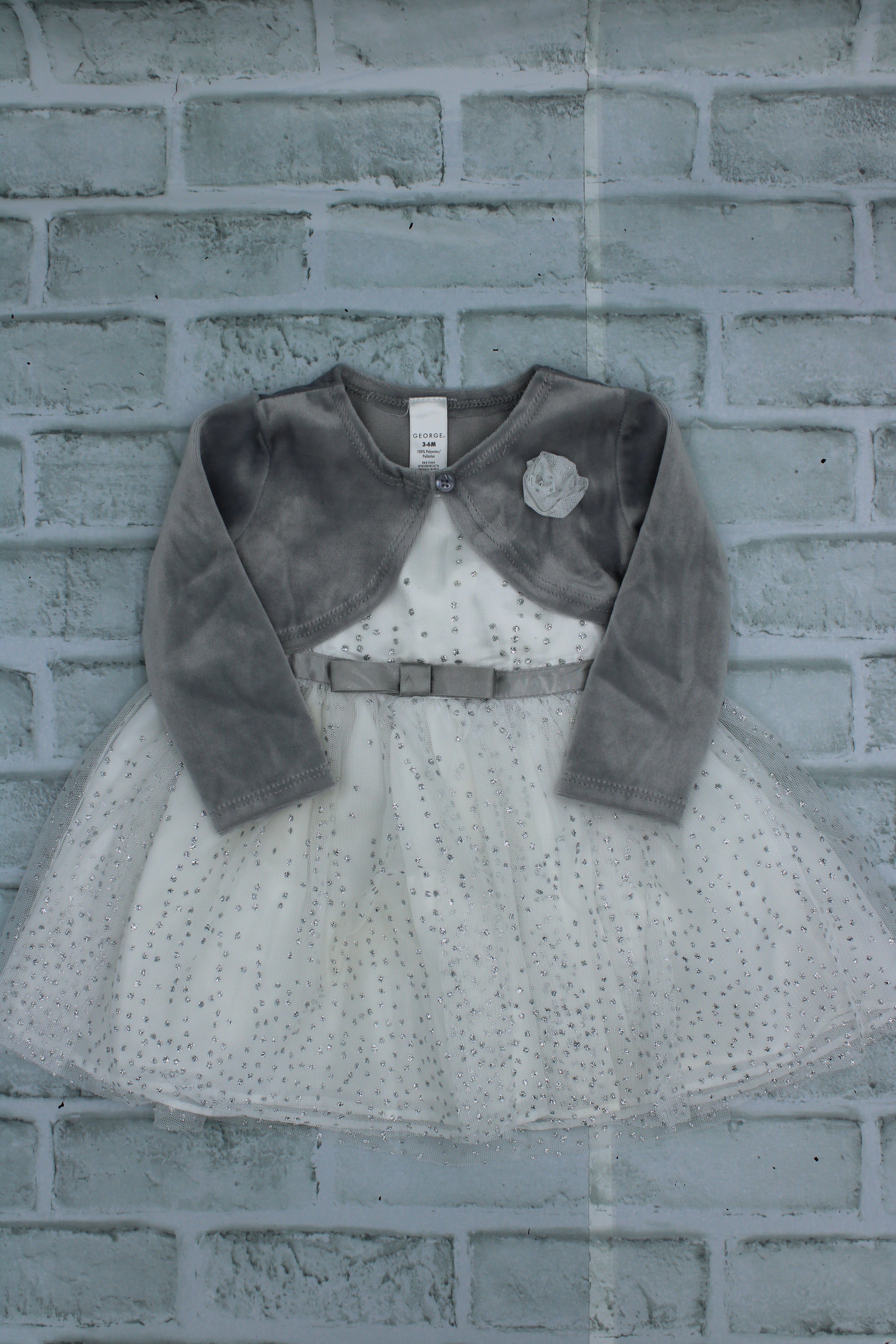 George, Silver Dress with cardigan, Excellent Condition, 3-6 Months is backordered and will ship as soon as it is back in stock.