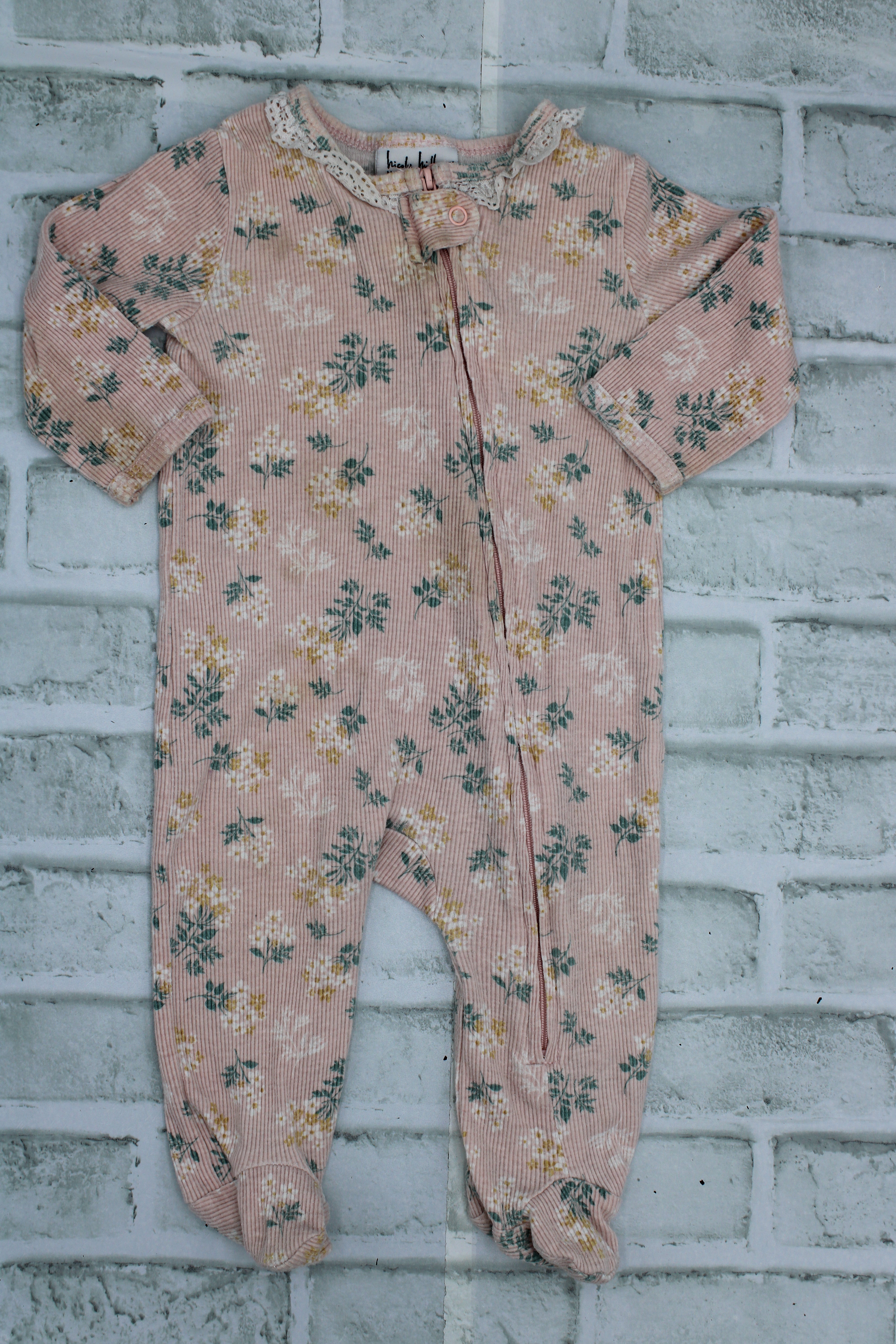 Nicole Miller, Floral Sleeper with Lace, small stain on wrist, 6-9 Months