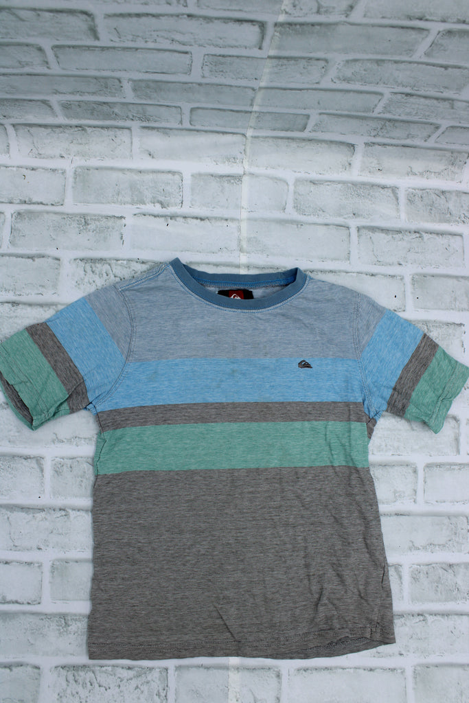 Quiksilver, Blue Striped Tshirt, hole by tag on neck, Size Medium (6)