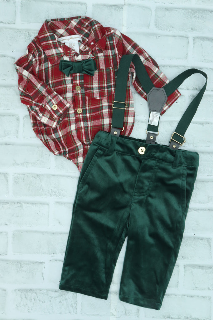 Tommy Bahama, Plaid Button Up Diaper Shirt with Velour Pants and Suspenders, 0-3 Months