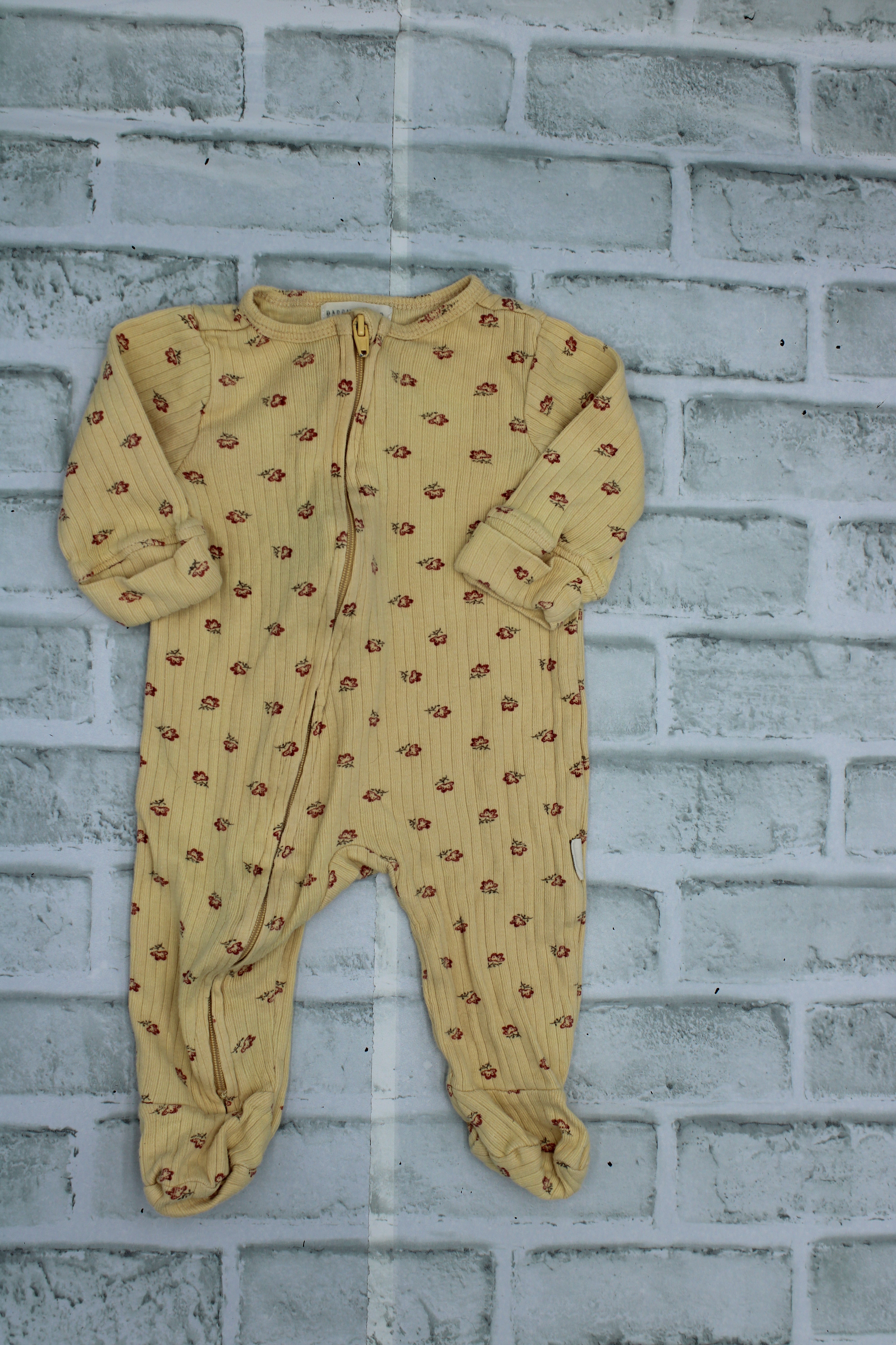 Rabbit & Bear, Yellow Floral Sleeper with foldover hands, some wear, 0-3 Months is backordered and will ship as soon as it is back in stock.