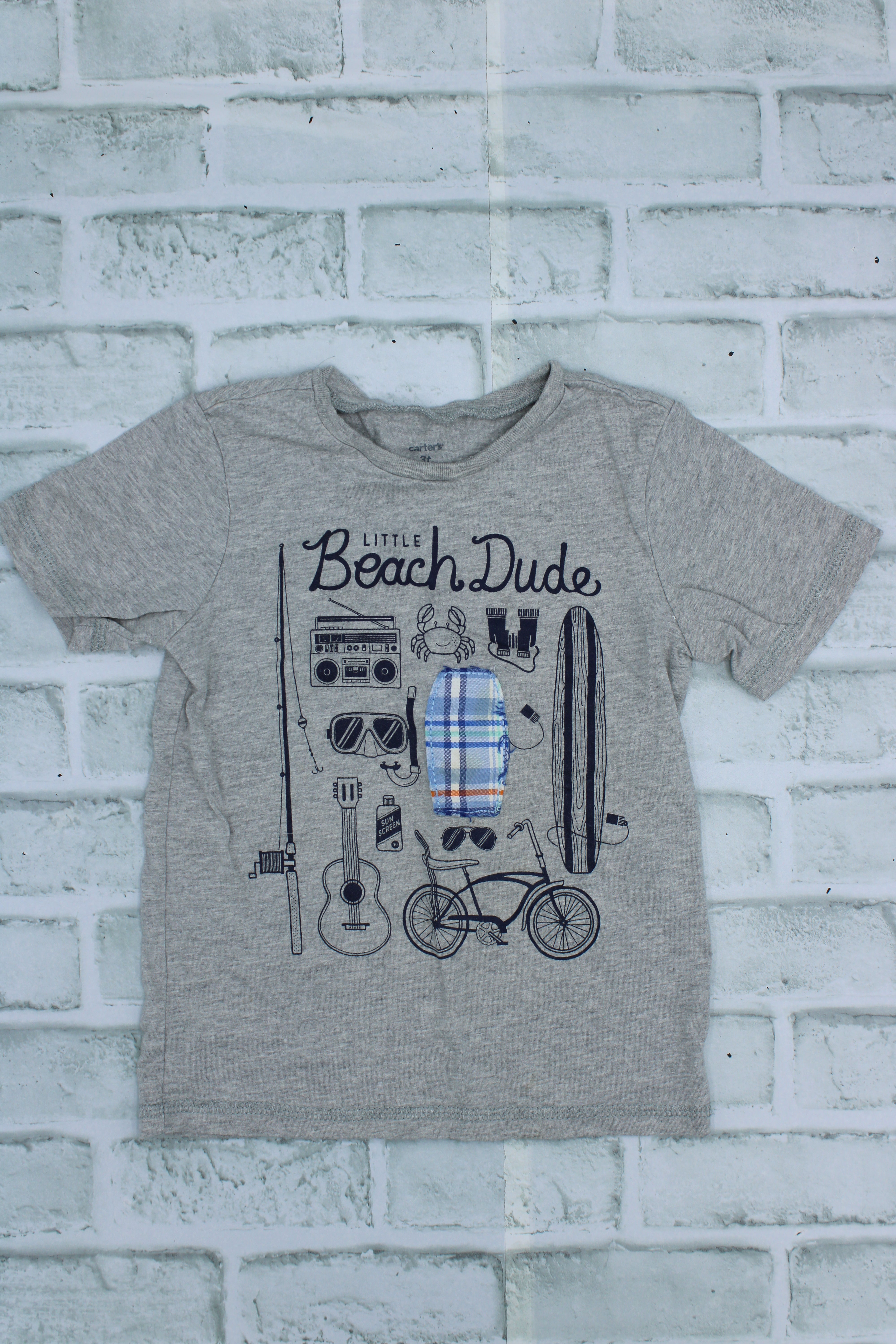Carters, "Little Beach Dude" light wear around neckline, 3T is backordered and will ship as soon as it is back in stock.