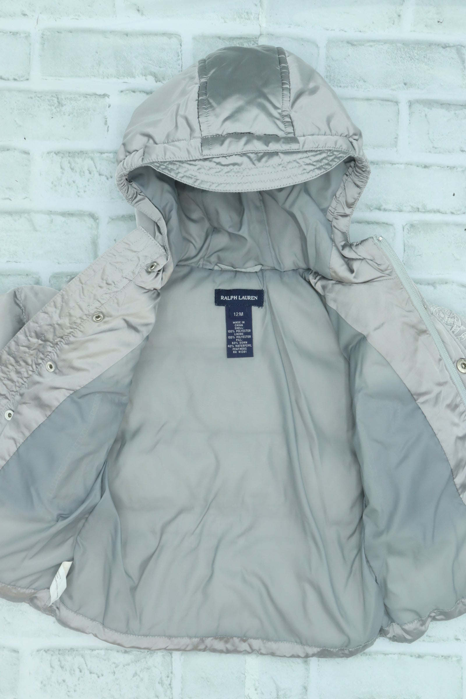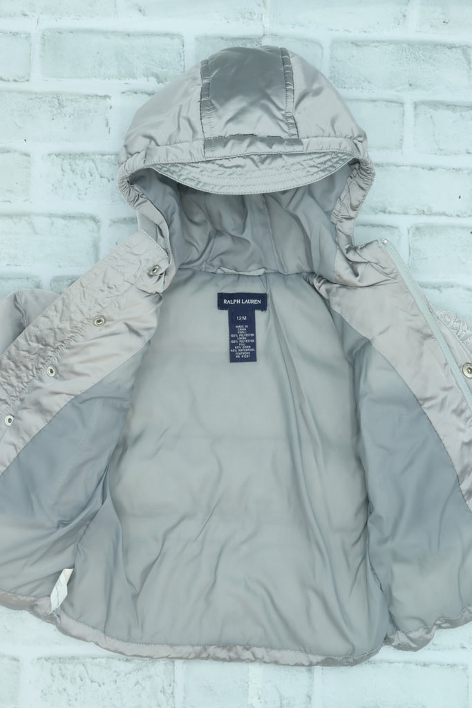 Ralph Lauren, Silver Puffer Jacket, GUC - missing one snap, 12 Month is backordered and will ship as soon as it is back in stock.