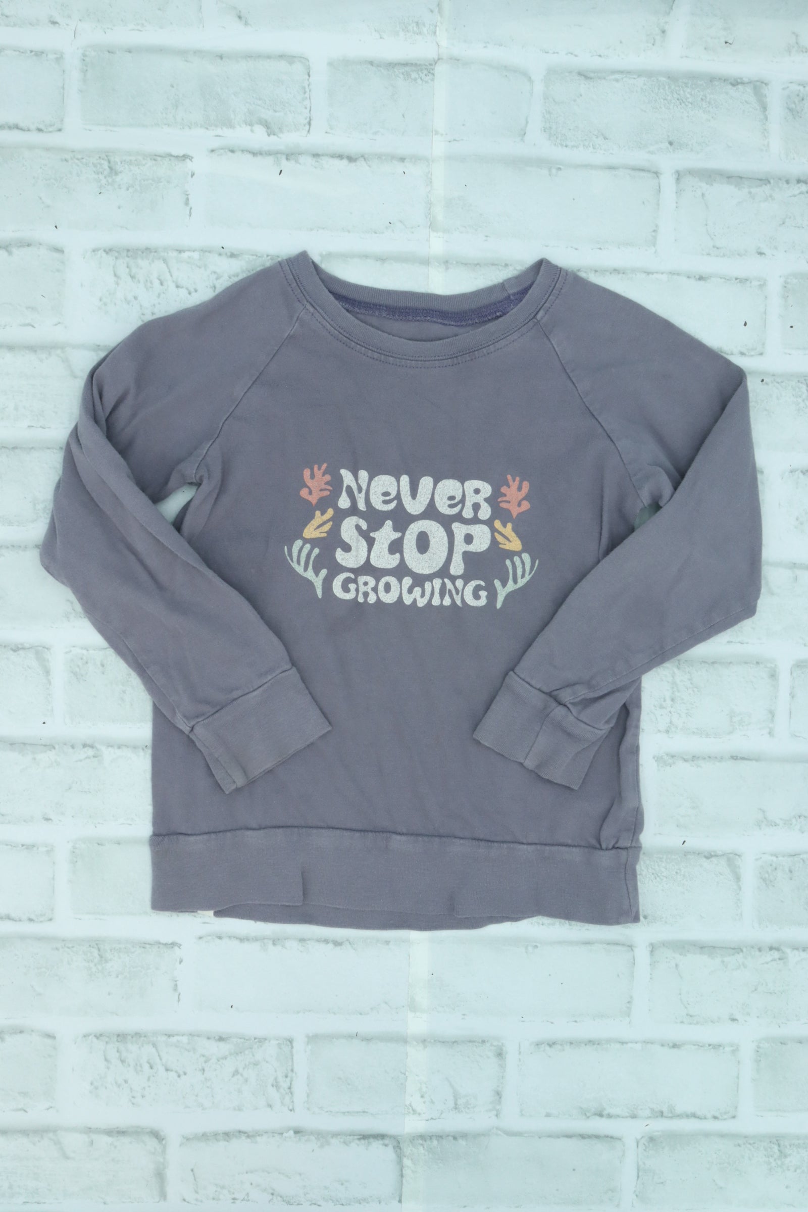 Mini Mioche, "Never Stop Growing" Long Sleeve, stain near lettering, Size 3/4