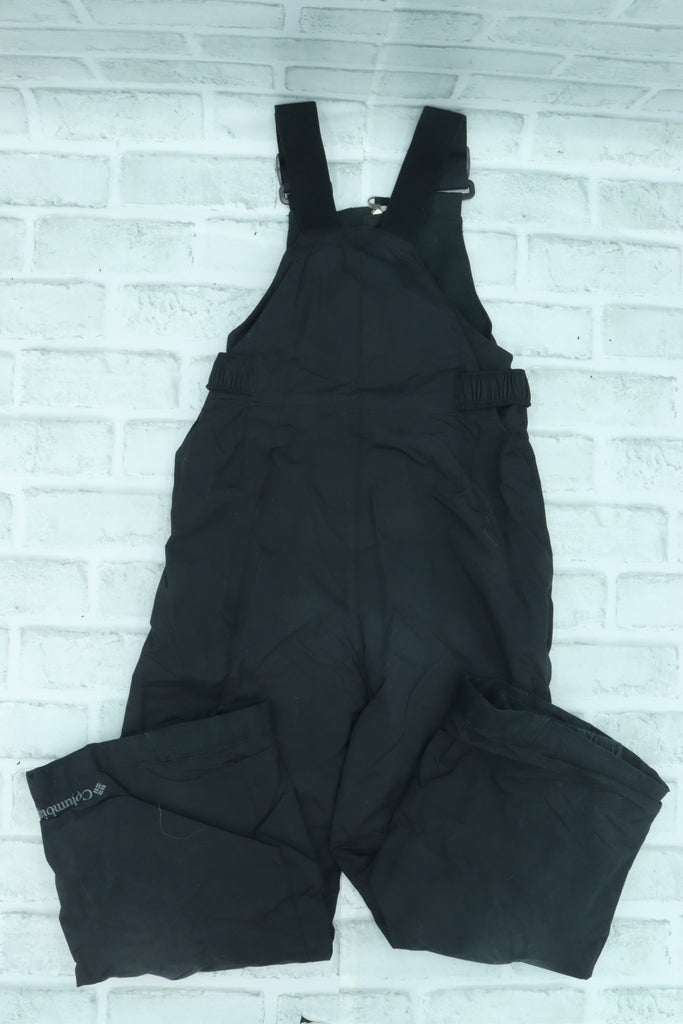 Columbia, Black Bib Midweight Snowpants, one knee has been stitched, XS (6/7) is backordered and will ship as soon as it is back in stock.