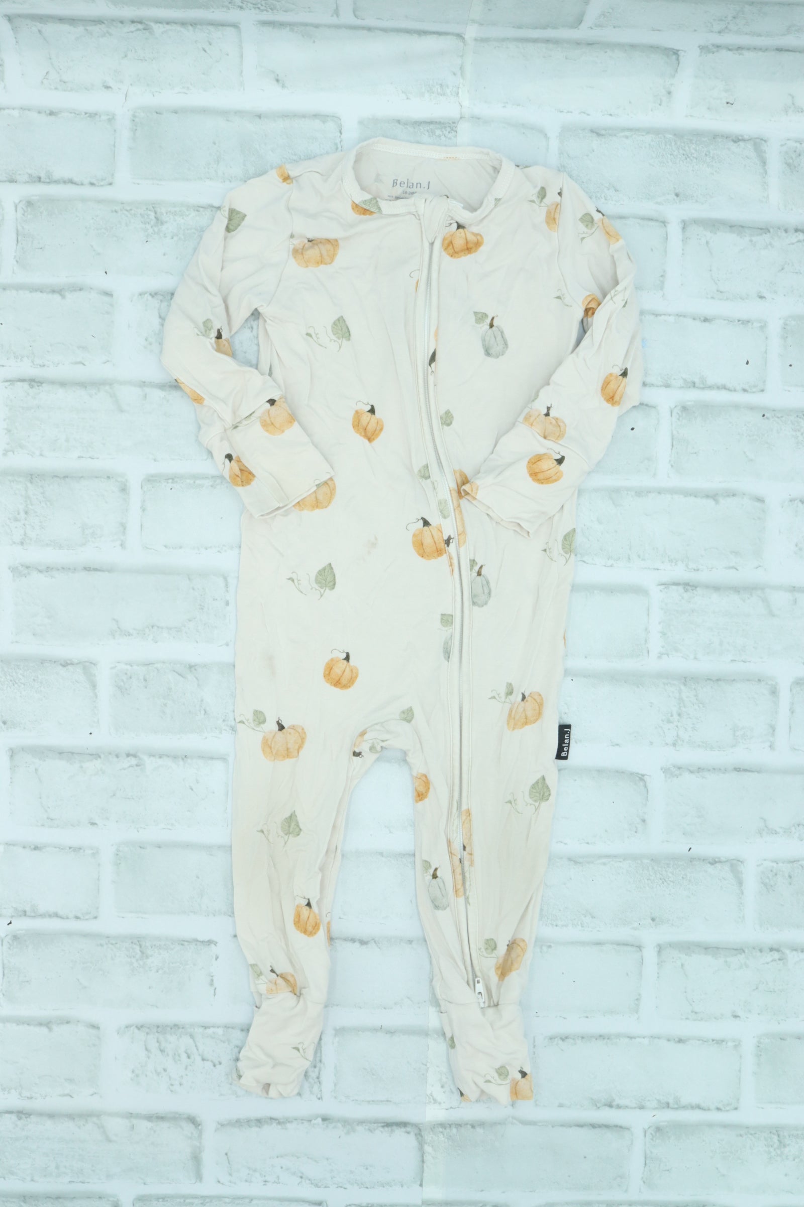 Belan J., Footless Bamboo Pumpkin Sleeper with Two Way Zipper, GUC due to various small stains/light wear, 18-24 Months is backordered and will ship as soon as it is back in stock.