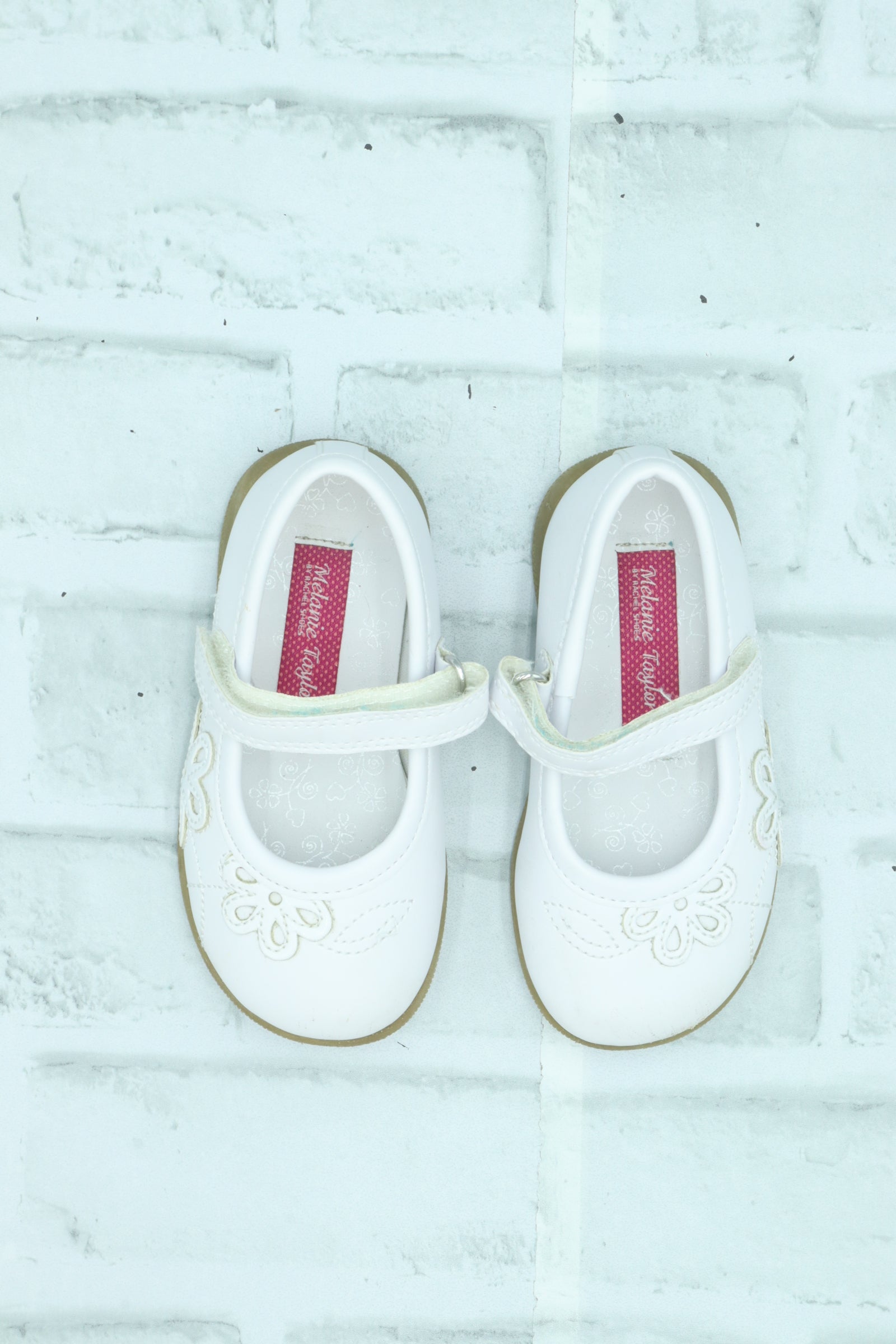 Melanie Taylor, White Daisy Flats, light wear/light scuffing, Size 6 is backordered and will ship as soon as it is back in stock.