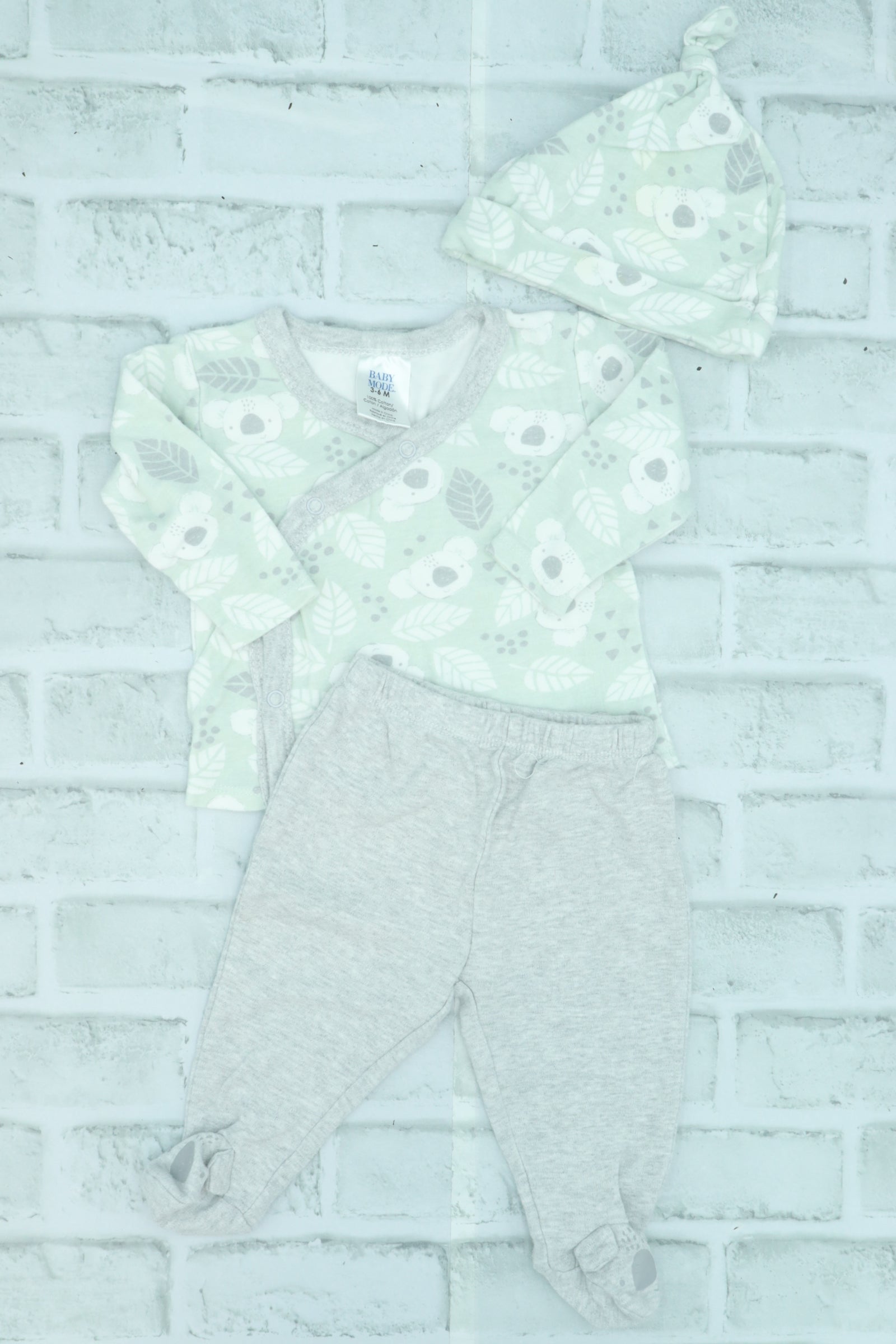 Baby Mode, 3 Piece Koala Set with Footed Pants, light stain on toque, 3-6 Months is backordered and will ship as soon as it is back in stock.