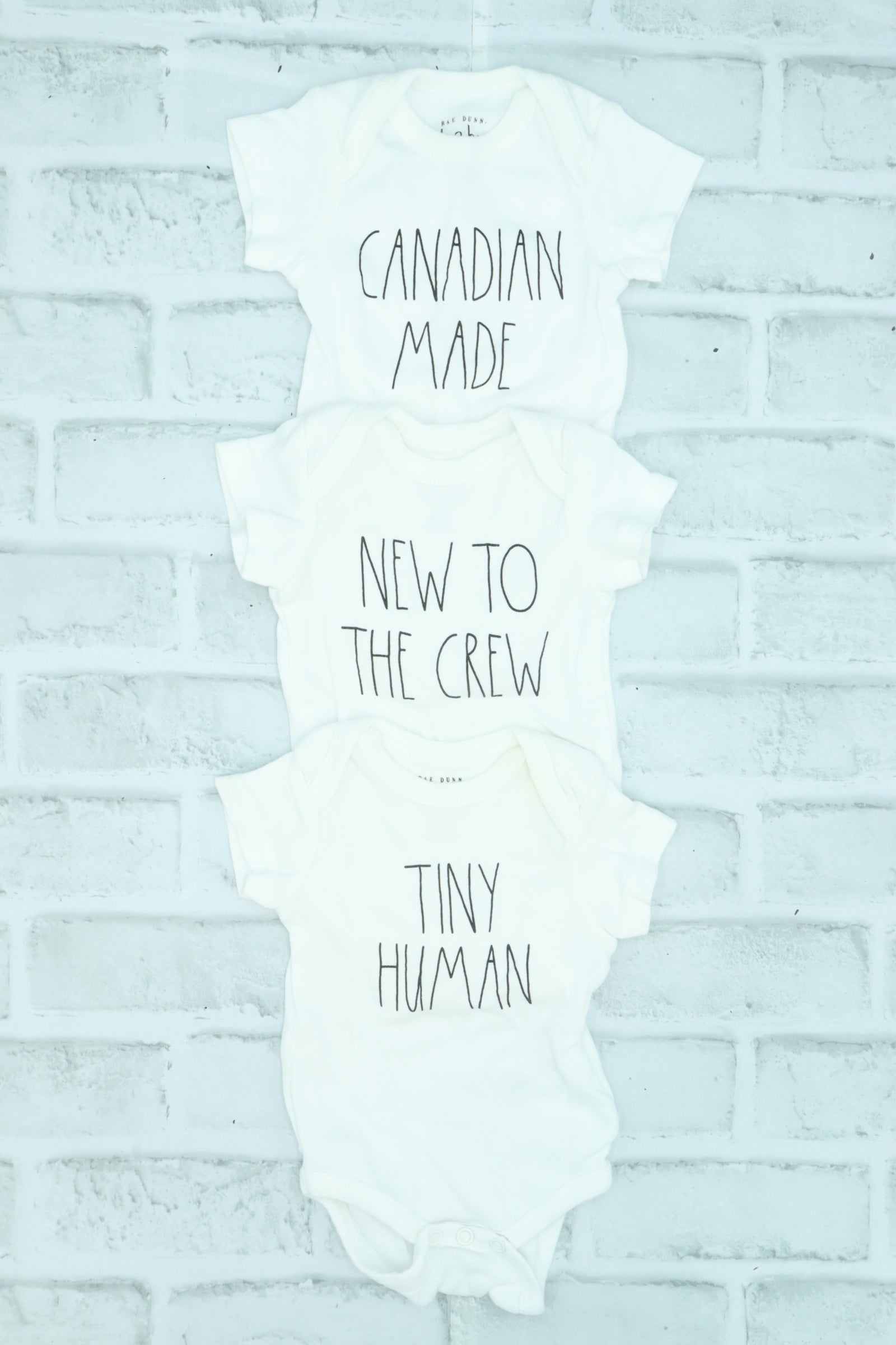 Rae Dunn, Set of 3 Diaper Shirts, yellowing on "Tiny Human" neckline, 0-3 Months is backordered and will ship as soon as it is back in stock.