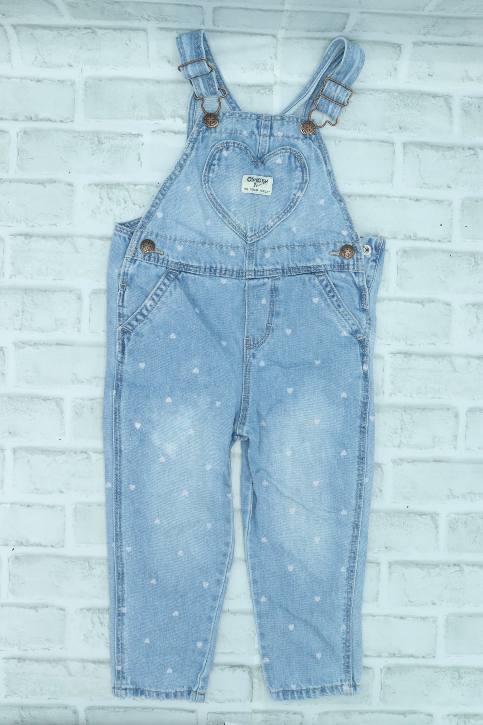 Osh Kosh, Denim Heart Print Overalls, GUC due to staining at knees, 3T