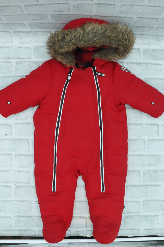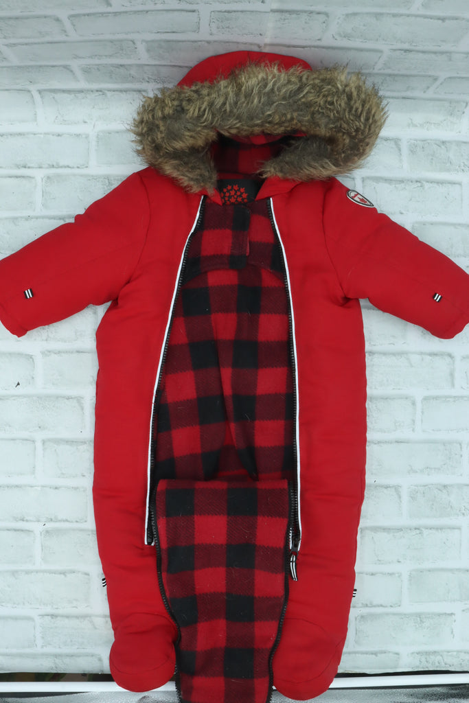Canadiana, Soft Shell Quilted Snowsuit with Fleece Lining and Faux Fur Trimmed Hood, light stain on back, 6-12 Months