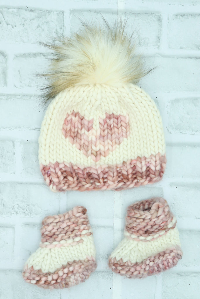 Handmade, Soft Knit Pom Heart Toque with Matching Booties, Like NEW, Approximately 0-6 Months