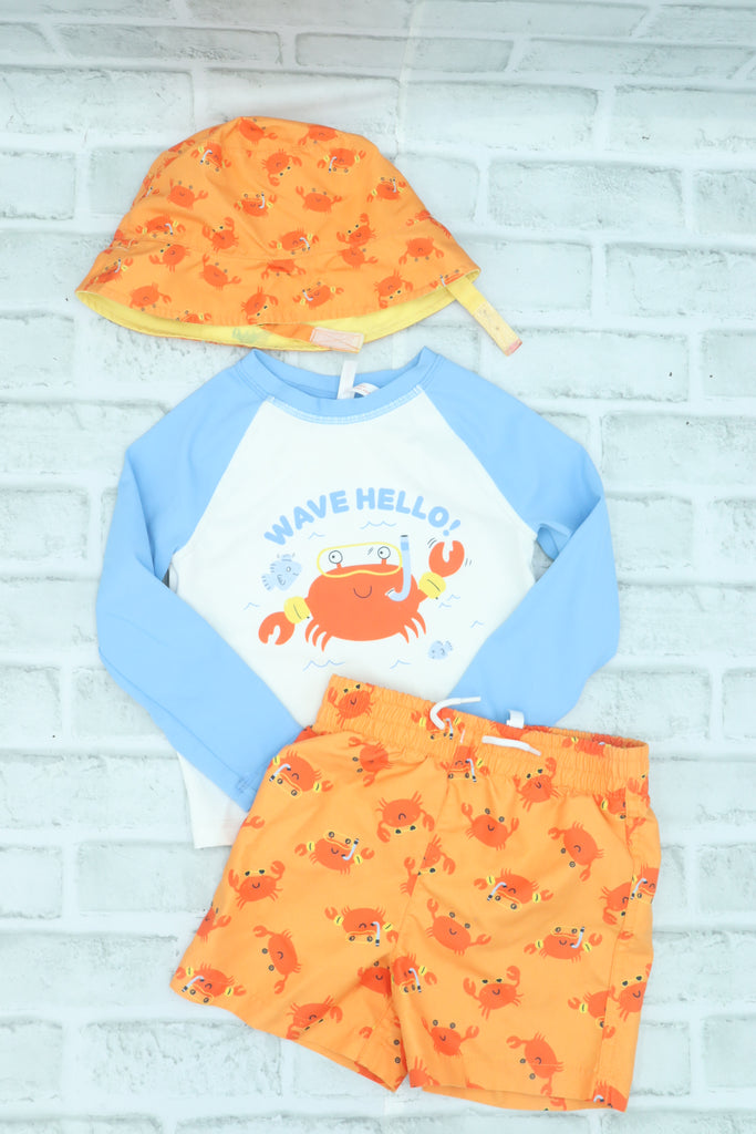 Joe Fresh, "Wave Hello" 3 Piece Swim Set, Shorts have Liner, Hat is GUC due to Staining on Reversible Side, 18-24 Months