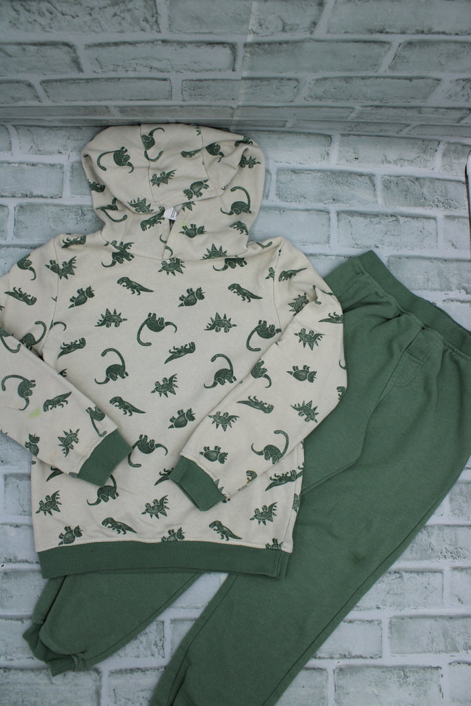 Brooklyn Boys, Beige and Green Dino Hoodie and Pant Set, GUC due to various staining on sleeves, Size 7