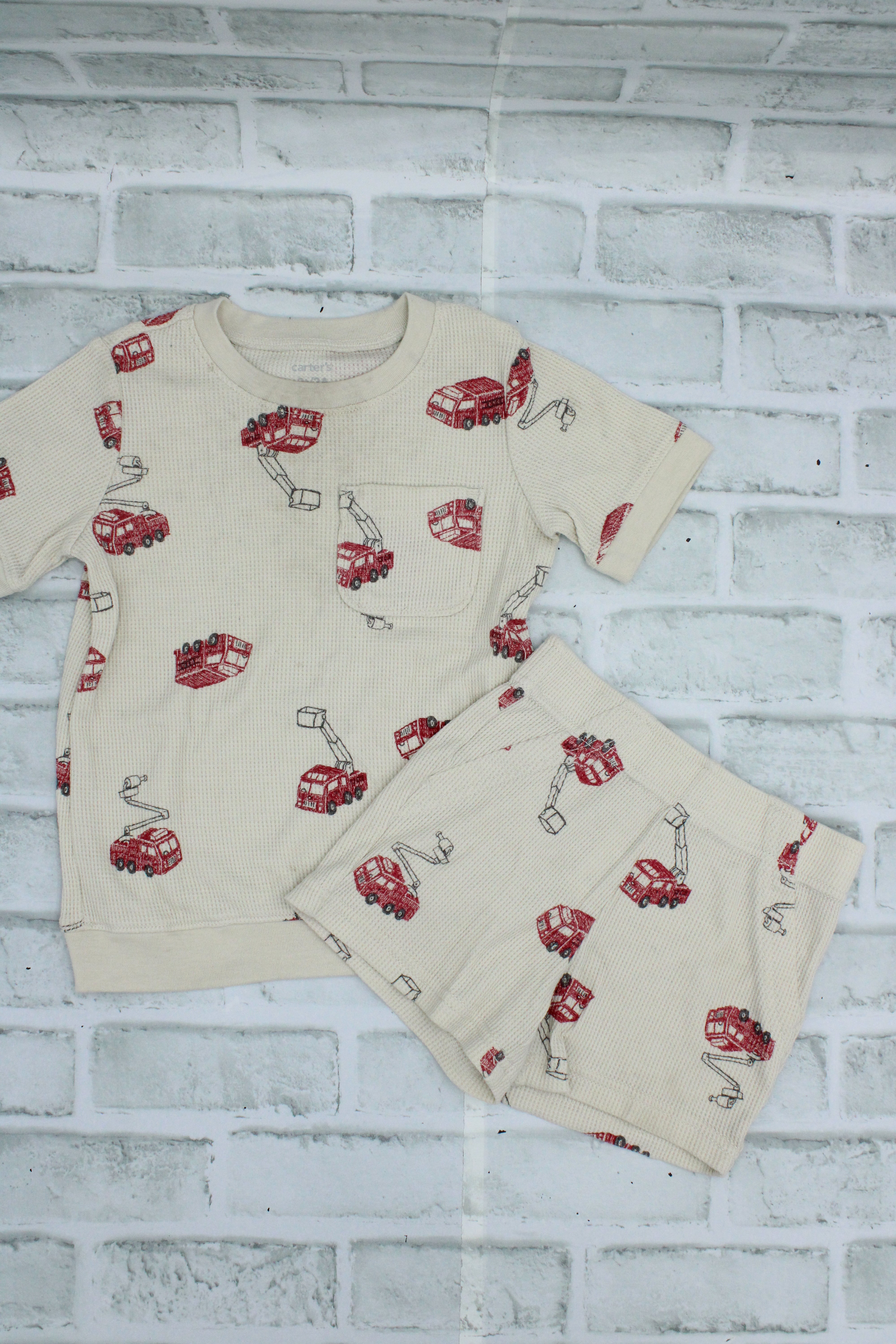 Carters, Firetruck Waffle PJ Set, light wear and staining on neckline, 2T is backordered and will ship as soon as it is back in stock.