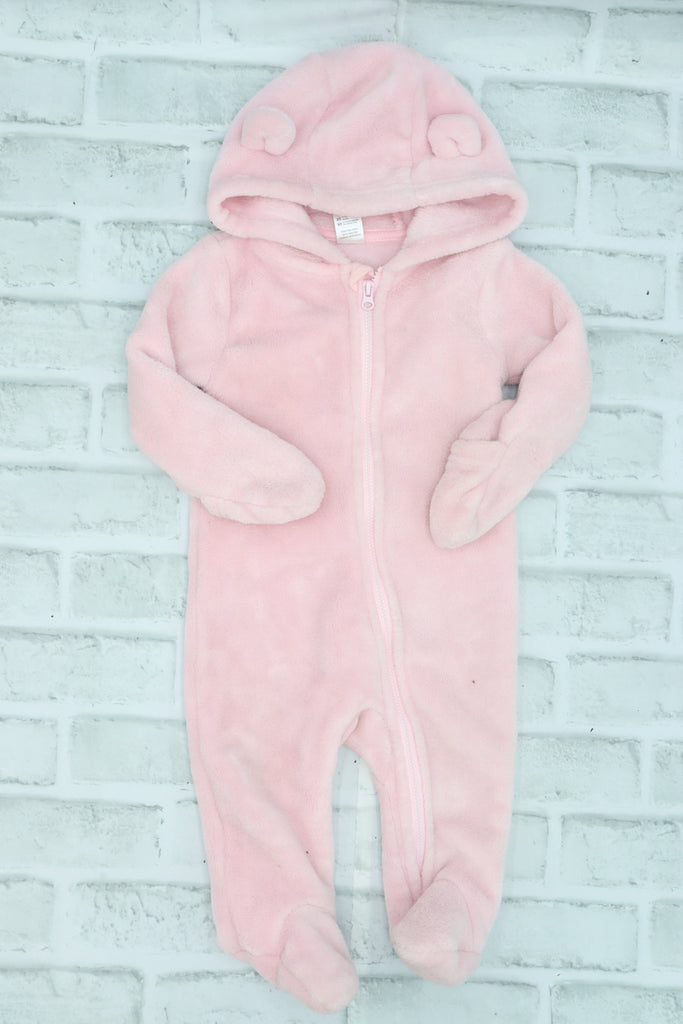 George, Pink Fuzzy Hooded Onesie with Foldover Hands, 6-9 Months