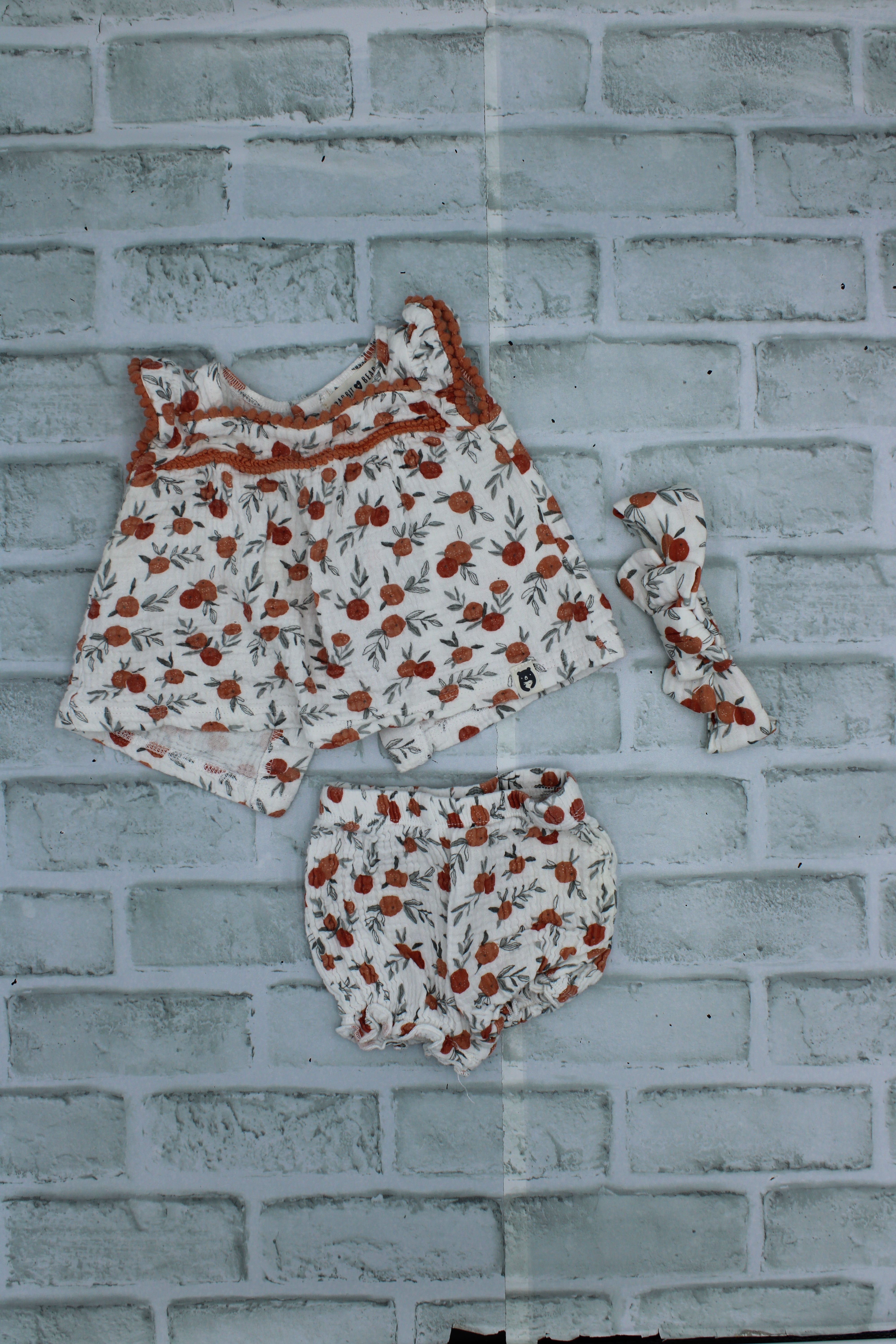 Rabbit & Bear, 3 Piece Set, Top has buttons down back, small stain on back, 0-3 Month is backordered and will ship as soon as it is back in stock.